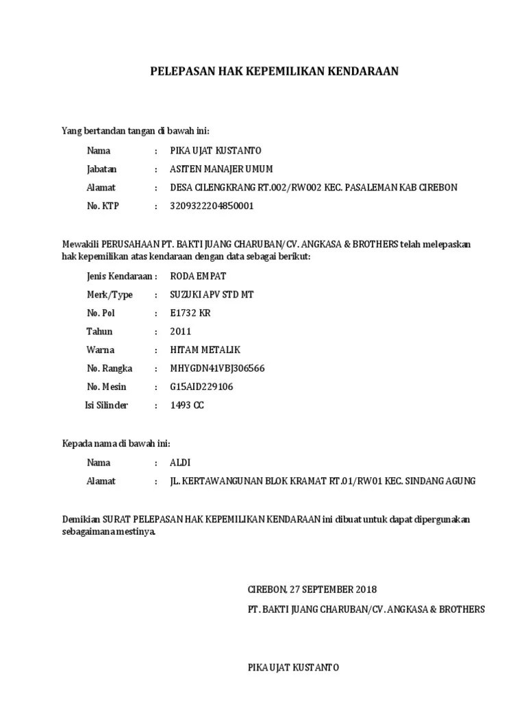 Membawa surat kuasa untuk balik nama kendaraan bermotor dari atas nama pribadi ke orang yang mengurus balik nama. Yang bertandatangan dibawah ini : Mengenal surat pelepasan hak atas tanah atau sppht rumah com. 7 syarat balik nama kendaraan perusahaan ke pribadi. Cara mengubah kendaraan atas nama pt ke nama pribadi. Surat ini menjadi pelengkap administrasi saat orang pribadi yang ingin balik nama kendaraan dari atas nama perusahaan menjadi atas nama . Gadai bpkb mobil semarang pinjaman jaminan bpkb cepat. Contoh surat perjanjian sewa mobil yang baik dan benar. Detail artikel terkait contoh surat pelepasan hak kendaraan dari perusahaan. Contoh surat pelepasan hak kendaraan atas nama perusahaan berbagi contoh surat. Surat pelepasan hak kepemilikan kendaraansurat pelepasan hak milik kendaraan merupakan surat yang dibuat oleh perusahaan yang akan melelang . Kp jati rt 06 rw 01 desa nanjung kec. Surat pelepasan hak kendaraan contoh surat pelepasan hak jual mobil perusahaan pdf.