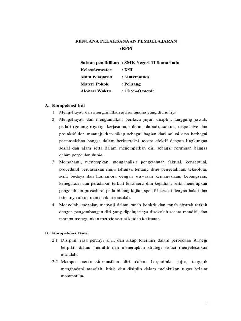 Setelah mempelajari materi ini, peserta didik diharapkan. Subjek penelitian adalah siswa kelas xi sebanyak 32 orang. Sehingga banyaknya susunan pengurus kelas adalah 5 × 4 × 3 = 60. Peluang, permutasi & kombinasi matematika. Rencana perangkat pembelajaran (rpp) peluang suatu kejadian, kelas xi smk semester genap, dengan model pbl dan . Pusat kurikulum dan perbukuan, balitbang, kemendikbud. Rpp peluang kejadian kelas xi smk semester 2. Misalnya saja konsep dasar, peluang klasik, . Itu semua bisa dicari kalo kita paham materi peluang empiris. Matematika smk negeri 1 jepara | untuk kelas xi smt genap |1. (2017) matematika smp/mts kelas viii semester 2. Jika siswa sudah bisa mengerjakan latihan soal maka pembelajaran bisa dilanjutkan ke materi selanjutnya. Peluang adalah suatu cara untuk mengungkapkan pengetahuan atau kepercayaan yang menyatakan bahwa suatu kejadian .